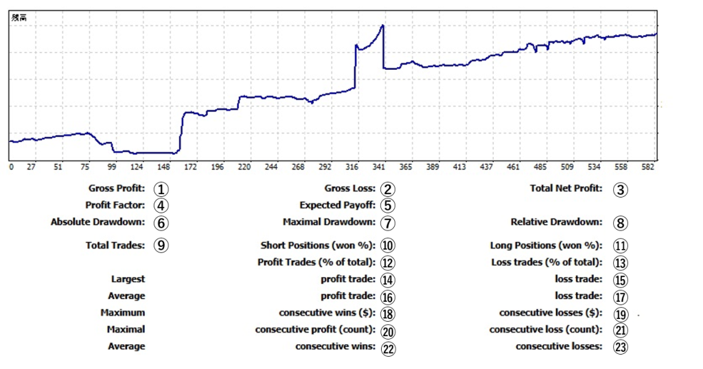- Profit Trades (% of total)(利益トレードの割合)勝ちトレードの割合(全トレード数に対する比率)。